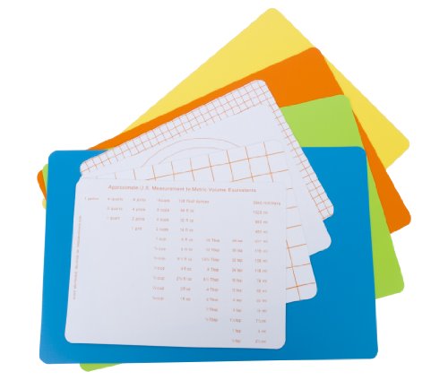 • 8-Pack of flexible plastic cutting boards; Four full size measure 15 by 11 inches; Four half sizes measure 11 inches by 8.5 inches